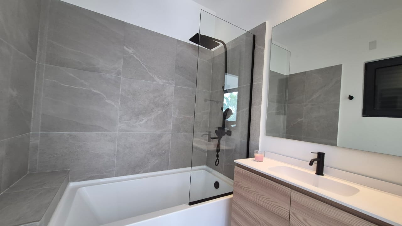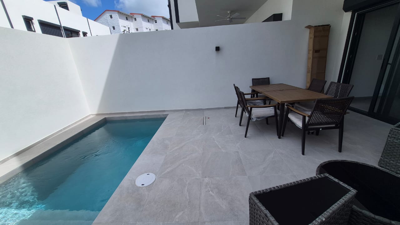 Modern open-concept living area with private pool, outdoor tiled patio and garden. The property has 2 assigned parking spaces and a spacious roof top terrace with mountain views.
